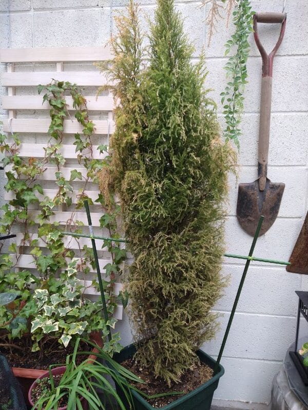 ゴールドクレストは根が浅く、結構倒れやすいと聞いていたので園芸支柱で補強していました