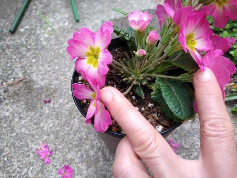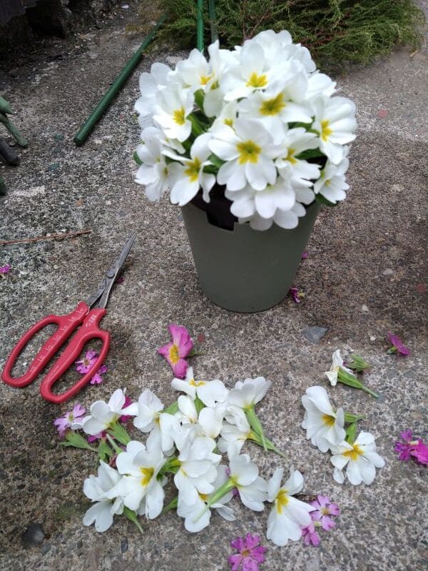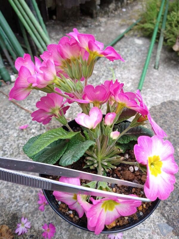 プリムラの花期が終わるまでもう少しあるので、葉ボタンを少し切って見栄えを整えてみます