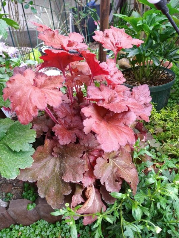 冬越しで葉がガッサガサだったヒューケラの新芽がグングン伸びてきました